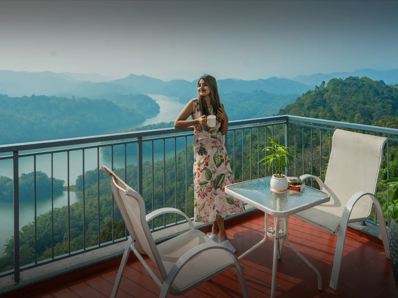 Cottages facing the oasis, nestled amidst the lush woods, provide breathtaking panoramic views of the lake. Cool breezes waft through the valley, creating unforgettable moments from both the bedroom and balcony. The cozy rooms and luxurious ambiance perfectly complement the stunning vistas, making it an ideal luxury getaway for both couples and families. The evening sunset from the balcony, adorned with rainbows, and the serene early morning views from the resort, create timeless memories, perfect for capturing and sharing with loved ones.